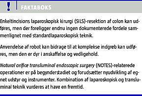 Summary Laparoscopic colorectal surgery - SILS, robots, and NOTES Ugeskr Læger 2011;173(14):1041-1044 Single incision laparoscopic surgery resection of colon is feasible, but so far evidence of benefit compared to standard laparoscopic technique is lacking. In addition to robot-controlled camera, there is only one robot system on the market capable of performing laparoscopic surgery. The da Vinci robot may contribute to making complex laparoscopic procedures easier to perform, but the system is costly in purchase and maintenance. Natural orifice transluminal endoscopic surgery aiming to reduce abdominal wall trauma is developing and bringing new technology. Combinations of laparoscopic and endoscopic techniques will expand future indications.