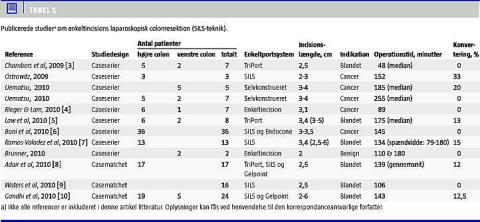 Den kliniske erfaring, der er opsummeret i Tabel 1 , er foreløbig ret begrænset [3-10]. Undersøgelserne understreger, at SILS-resektion af colon er gennemførlig [11], men de publicerede data muliggør imidlertid ikke en onkologisk validering af resektion af coloncancer. Det er heller ikke vist, at SILS-metoden giver færre smerter postoperativt, og på sigt kan man ikke udelukke, at den lidt større incision i den periumbilikale fascie kan medføre et øget antal incisionelle hernier.