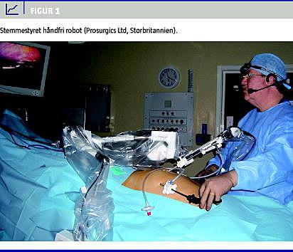 En kirurgisk robot kan beskrives som et hersker-slave-system, der er designet til at styrke kirurgens formåen. Den enkleste robot har en passiv rolle, idet den alene styrer laparoskopet. Kameraet holdes af en arm, som er forbundet til en computer og styres af kirurgen enten ved en sensor, som reagerer på bevægelse af kirurgens hoved, eller en stemmestyret mekanisme (Figur 1 ). Robottens arm muliggør et roligt billede, og assistenten slipper for at holde kameraet [12, 13].