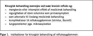 Mulige operationsindikationer fremgår af Figur 1 . Ingen indikationer er absolutte. Endelig beslutning om operation træffes under en samtale mellem kirurgen og patienten, som bliver fuldt informeret om indgrebet, reflukskontrol, mulige bivirkninger samt postoperativ morbiditet.