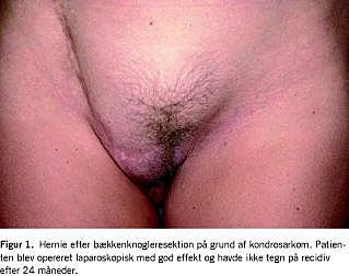 Incisionalhernier efter abdominalkirurgi opstår hos 10-20% af patienterne, og op mod 50% får recidiv efter primær herniotomi [1, 3]. I modsætning hertil er der kun beskrevet få tilfælde med herniedannelse efter et kondrosarkom og bækkenknogleresektion [2], og tilfælde med kæmpehernie og lapa-roskopisk operation synes ikke at være blevet beskrevet tid-ligere i litteraturen.