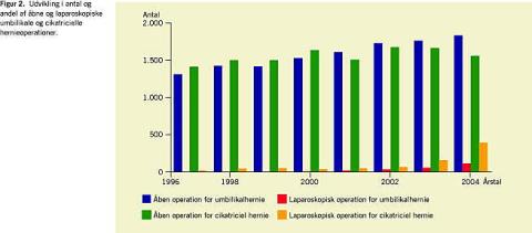 LVH har gennem de seneste 10-12 år vundet større og større indpas i behandlingen af ventralhernier. Fra at være en operationsmetode, man var tilbageholdende med at tilbyde, og på trods af at den kan være teknisk krævende, er den nu implementeret på mange kirurgiske afdelinger som et reelt tilbud i behandlingen af ventralhernier. De seneste otte års udvikling har vist en stigning i antallet og andelen af patienter der opereres laparoskopisk for ventralhernie (Figur 2 ). Hvorvidt denne udvikling er et udtryk for, at patientgruppen vokser, eller om det er et udtryk for mere lempelige indikationer, er uvist; der er formentligt tale om en kombination. I betragtning af at der hos op mod en fjerdedel af alle patienter, der tidligere har gennemgået en abdominaloperation, vil udvikles et incisionelt hernie, er der tale om et betydeligt patientvolumen. Med den laparoskopiske kirurgiske teknik kan vi nu tilbyde en effektiv behandling, tilsyneladende med få risici. Disse forhold kan i sig selv resultere i en mere lempelig indikation, som kan føre til en bekymrende stigning i antallet af operationer udført på årsbasis.