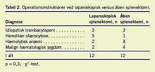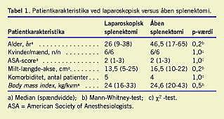 De to grupper var sammenlignelige mht. køn, alder, body mass index, American Society of Anesthesiologists (ASA)-score, miltstørrelse (målt som længdeaksen af milten ved computertomografi eller ultralydskanning) (Tabel 1 ) og operationsindikation (Tabel 2 ).