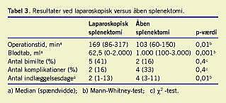 Det skal anføres, at udtalt splenomegali kan vanskeliggøre indgrebet og øge morbiditeten i forbindelse hermed ved laparoskopisk teknik, hvilket også fremgår af den eneste randomiserede undersøgelse af laparoskopisk versus åben splenektomi [13].