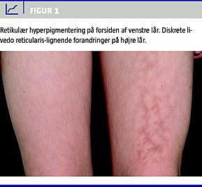 Ved objektiv undersøgelse fandtes bilateral livedo reticularis og en brunlig retikulær hyperpigmentering. Ved palpation af huden fik man indtryk af let atrofi (Figur 1 ). Man bemærkede i øvrigt, at huden på 2.-4. fingers pulpae var keratotisk fortykket og skællende.