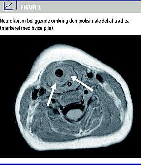 Dagen efter overflytningen blev der foretaget laryngoskopi, trakeoskopi og øsofagoskopi i generel anæstesi. Man fandt en rumopfyldende bløddelsproces beliggende i venstre bageste del af larynx og den proksimale del af trachea. Processen var ca. to en halv centimeter lang. En computertomografi viste en ca. to centimeter lang subglottisk homogen ringformet struktur om trachea (Figur 1 ). På baggrund af dels kliniske fund og dels fund ved skanningen blev der taget biopsier fra det subglottiske område. Patologisvaret viste pleksiformt neurofibrom. Tumoren infiltrerede både larynx, den proksimale del af trachea og hypopharynx. Radikal kirurgi var derfor ikke mulig. Da barnets respiratoriske situation var uholdbar, blev han trakeotomeret. Efterfølgende har han ikke haft respirationsproblemer. Han blev fulgt med magnetisk resonans-skanninger af cerebrum, hals og thorax hvert halve år. Frem til opgørelsestidspunktet havde der ikke været progression af det laryngeale neurofibrom.