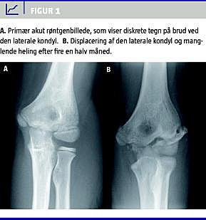 På skadestuen udfordres den yngre læge, når diagnosen skal stilles. Røntgenbilleder af umodne børnealbuer kan være vanskelige at fortolke, selv for en trænet speciallæge, når capitellum først ossificerer i 9-10-års-alderen, og når frakturlinjerne i nogle tilfælde først er synlige 7-10 dage efter skaden. En fraktur af lateral kondyl kan på et røntgenbillede fremstå som værende uforskudt og alligevel være af ustabil type. Erkendes denne problemstilling ikke på skadestuen, kan det medføre fejlbehandling og senere konsekvenser for barnet, hvilket belyses i denne kasuistik.