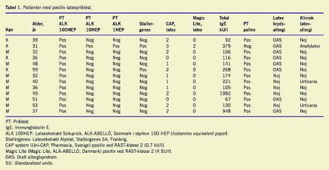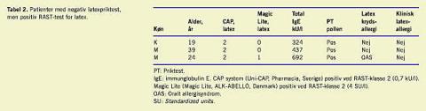 Tre (5%) af patienterne havde positiv latex-RAST-test, men negativ PT over for latex (Tabel 2 ). Kun CAP-RAST-testen var positiv (klasse 2), mens Magic Lite-testen var negativ. Alle tre havde forhøjet total IgE. Ingen af dem havde udvist symptomer på klinisk latexallergi.