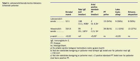 Ved at sammenholde gruppen af latexsensibiliserede patienter med de ikkelatexsensibiliserede fandt man, som allerede omtalt, tydelige forskelle (Tabel 3). Kønsfordelingen var skæv, idet 11 (44%) af mændene mod kun fem (13%) af kvinderne var sensibiliserede (p <0,02). Gruppen af latexsensibiliserede havde højere total-IgE end gruppen af ikkesensibiliserede (median 198 kU/l vs. 95 kU/l). Forskellen var dog ikke signifikant. Endvidere havde de sensibiliserede flere positive standard-PT end de ikkesensibiliserede (median 4 vs. 2; p < 0,05).