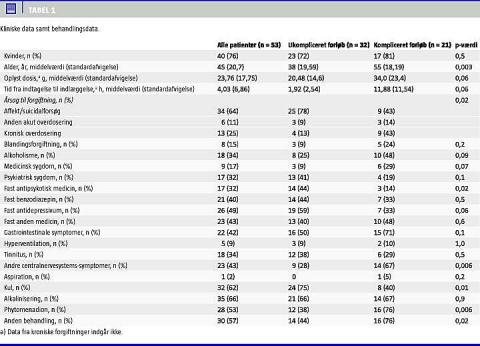 Resultater: Ved komplicerede forløb fandtes flere med en kronisk forgiftning (43% versus 13%, p = 0,02), højere alder (55 år versus 38 år, p = 0,003) og flere medicinsk syge (24% vs 9%,