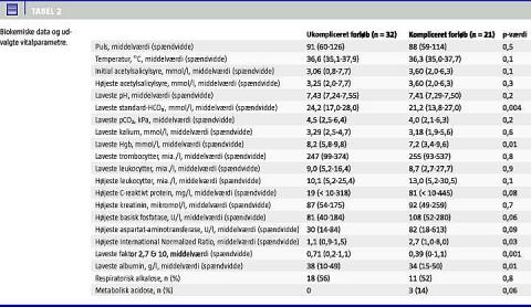 Den lavest målte Hgb-værdi var signifikant lavere i den komplicerede gruppe. Ligeledes var der signifikante forskelle på flere leverparametre, således at leverfunktionen i gruppen med det komplicerede forløb var mere påvirket. Højest målte C-reaktivt protein-værdi syntes også at være højere i den komplicerede gruppe, men dette var dog ikke signifikant. Der var ingen forskel grupperne imellem med hensyn til kalium, leukocytter og trombocytter og kreatinin.