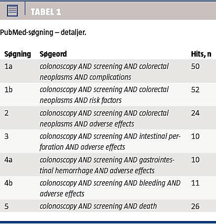 Litteratursøgningen i PubMed blev foretaget ud fra følgende kriterier: engelsksprogede reviewartikler, maksimalt fem år gamle. Der blev dels foretaget en generel søgning om komplikationer i forbindelse med koloskopi, dels særskilte søgninger om de enkelte komplikationer. Originalartikler blev fundet ud fra de udvalgte reviewartikler. Literatursøgningen blev afsluttet den 20. marts 2011. Se anvendte søgeord i Tabel 1. Inklusionskriterier: Artikler omhandlende screening med koloskopi for KRC.