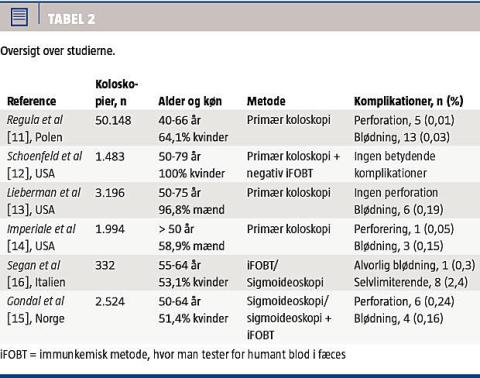 Studierne adskiller sig fra hinanden på flere punkter.. I [11-14] anvendtes der primær koloskopi, hvorimod man i [15, 16] anvendte iFOBT og/eller fleksibel sigmoideoskopi (FS). I begge studier henvistes der til koloskopi ved positiv iFOBT eller fund af polypper > 10 mm ved sigmoideoskopi. I Schoenfeld et al’s studie indgik der udelukkende kvinder, mens næsten alle deltagere var mænd i Lieberman et al’s studie. Regula et al’s studie omfattede personer, der var fyldt 40 år og havde familiær disposition til KRC, mens den øvre aldersgrænse i Gondal et al’s og Segan et al’s studier var 64 år til forskel fra aldersintervallet 50-74 år i det planlagte danske screeningsprogram (Tabel 2).