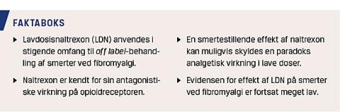 Recent years have seen an increasing interest in the use of low dose naltrexone (LDN) for off-label treatment of pain in diseases as fibromyalgia, multiple sclerosis and morbus Crohn. The evidence is poor, with only few randomized double-blind placebo-controlled studies. The studies currently available are reviewed in this paper. LDN could be a potentially useful drug in the future for the treatment of pain in fibromyalgia, but more studies are needed to verify that it is superior to placebo, and currently it cannot be recommended as first-line therapy