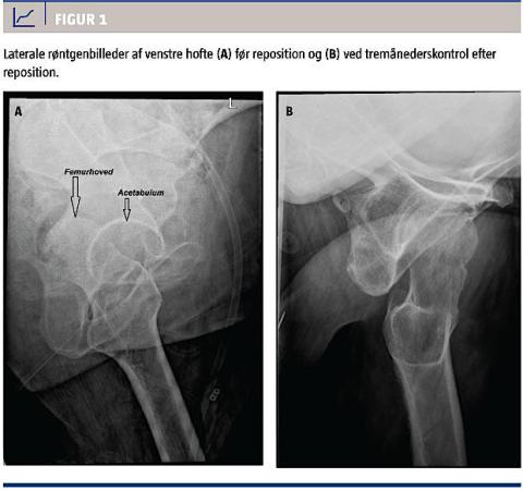 En objektiv undersøgelse viste forkortning og indadrotation af venstre underekstremitet. Således var der klinisk mistanke om brud på lårbenshalsen, men anterior-posterior-røntgenoptagelser viste ingen tegn på fraktur, hvorimod en lateral optagelse viste bagre luksation af venstre hofte (Figur 1A). Der blev foretaget lukket reposition af hofteleddet med opnåelse af normal længde og stilling af venstre underekstremitet. En kontrolrøntgenskanning og CT efter reposition bekræftede hofteleddets anatomiske stilling, dog med en mindre avulsion af den bagerste kant af acetabulum, hvilket blev behandlet konservativt. Patienten påbegyndte genoptræning hos en fysioterapeut på hospitalet og kunne tåle fuld vægtbelastning under træningen.