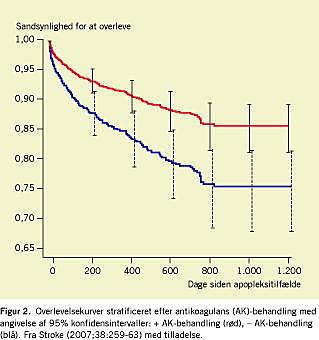 En Cox proportional hazard-regression blev udført mhp. identifikation af faktorer med betydning for overlevelse hos apopleksipatienter med AF. Alder og apopleksiens sværhedsgrad var de stærkeste prædiktorer af levetid; sandsynligheden for død var mindst hos yngre personer og hos patienter med lette apopleksier. Risikoen for død var næsten fordoblet hos patienter, der ikke kom i AK-behandling (hazard ratio (HR): 1,91, 95% konfidensinterval (KI): 1,44 til 2,52). Øvrige faktorer i analysen, fraset DM (HR: 0,61; 95% KI: 0,42-0,89), var ikke signifikante. Overlevelseskurver for patienter, der havde fået AK-behandling, og patienter, der ikke havde fået AK-behandling, ses i Figur 2. Patienter, der døde under hospitals-indlæggelsen, blev inkluderet i analysen. Når disse patienter (8% af alle indlæggelser) blev udeladt fra analysen, var HR noget lavere, 1,74, (95% KI: 1,26-2,39).