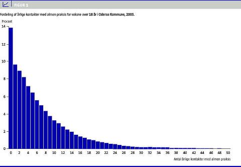 Fordelingen af antal kontakter med almen praksis er vist i Figur 1 . I 2005 var 86% af de voksne i kontakt med almen praksis i Odense, og 45% havde flere end fem årlige kontakter. Til sammenligning havde 85% af alle borgere kontakt med almen praksis på landsplan i 2001 [13]. I analyserne blev ekstreme observationer (den 1% der havde flest kontakter - dvs. mere end 40 årlige kontakter) frasorteret. Det havde dog ingen nævneværdig indflydelse på resultaterne. I den endelige stikprøve var det gennemsnitlige årlige antal kontakter med almen praksis 6,8, og medianen var fem.