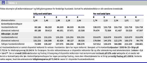 I Tabel 1 anskueliggøres den anvendte indkomstvariabel og fattigdomsgrænse ved at omregne fiktive bruttoindkomstniveauer for givne husstande (på kontanthjælp og med lav indkomst) til ækvivaleret disponibel indkomst. Tabellen viser, at et par på kontanthjælp ikke vi l figurere som fattige, mens enlige kontanthjælpsmodtagere og alle kontanthjælpsmodtagere med børn vil figurere som fattige. Lavt-lønnede par vil ikke figurere som fattige, mens enlige lavtlønnede vil figurere som fattige, såfremt de har mindst tre børn. Det skal understreges, at faktiske forhold kan variere meget fra disse stereotype eksempler, f.eks. ved at personer på kontanthjælp enten modtager lavere (starthjælp) eller højere (varmetilskud, særlig hjælp etc.) ydelser fra det offentlige, eller fordi en familie har lavere indkomster end de nævnte og eventuel forsørgerpligt for anden ægtefælle.