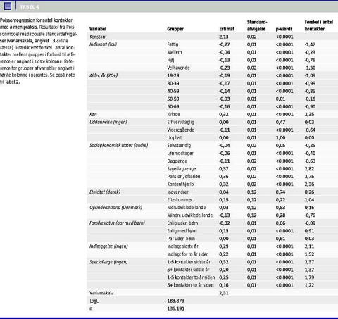 Tabel 4 viser sammenhængen mellem årlige kontakter med almen praksis og indkomst efter justering for køn, alder, uddannelse, socioøkonomiske gruppe, familiestatus, indvandringsstatus, oprindelsesland og helbredsindikatorerne. Det ses af femte kolonne, at antallet af kontakter var signifikant forskelligt fra referencegruppen med lav indkomst (73.000-146.000) for alle indkomstgrupperne. De fleste variabler har den forventede association, hvad angår antal kontakter med almen praksis.