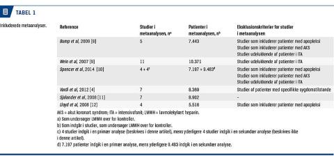 af metaanalyserne afhænger af, om de inkluderede RCT’er er sammenlignelige. De metaanalyser, der er nævnt i denne artikel, bygger på RCT’er, hvor risikoen for VTE i studiepopulationen varierede, udtrykt ved hyppigheden af VTE i placebogruppen. Eksempelvis indgår et større RCT af Mahé et al [16] (n = 2.474) i fire af de ovennævnte metaanalyser [4, 8, 10, 11].