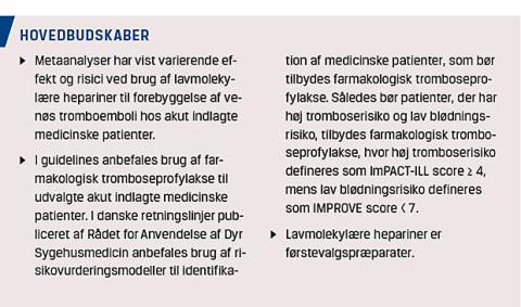 Hvis farmakologisk tromboseprofylakse benyttes i en selekteret gruppe af akut indlagte medicinske patienter med høj risiko for VTE, foreligger der således evidens for gavnlig effekt. I den kliniske hverdag bør indlagte medicinske patienter, der er i høj risiko for VTE, identificeres og sættes i profylaktisk behandling. Identifikation af patienter, der er i høj risiko for VTE kan ske ud fra risikovurderingsmodeller som Padua Prediction Score eller ImPACT-ILL-modellen.