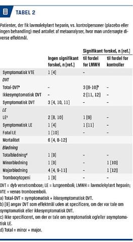 I Tabel 2 vises effektmål og resultater fra metaanalyser af sammenligning af kontrolpersoner og akut indlagte medicinske patienter, der var i behandling med lavmolekulært heparin (LMWH) (eller fondaparinux). Metaanalyserne viste varierende effekt af medicinsk tromboseprofylakse på forebyggelse af VTE. Man fandt ikke i nogen studier forskel på mortaliteten hos patienterne i interventionsgrupperne og kontrolpersonerne. De fleste studier, hvor man rapporterede om blødningsrisiko, viste, at medicinsk tromboseprofylakse ikke var forbundet med øget risiko for major blødning.