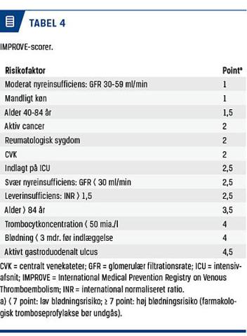 I Danmark offentliggjorde Rådet for Anvendelse af Dyr Sygehusmedicin (RADS) i november 2015 en behandlingsvejledning for tromboseprofylakse til blandede, akut indlagte, medicinske patienter [15]. Medicinsk tromboseprofylakse anbefales til udvalgte patienter. Førstevalgspræparat er LMWH. ImPACT-ILL-risikovurderingsmodellen (Tabel 3) anvendes til identifikation af patienter, der er i høj risiko for VTE, mens IMPROVE-risikovurderingsmodellen (Tabel 4) anbefales anvendt til identifikation af patienter med høj blødningsrisiko. Som anført i behandlingsvejledningerne kontraindicerer en række tilstande brug af farmakologisk VTE-profylakse. Disse tilstande er bl.a. svær hypertension, antikoagulansbehandling og aktiv blødning.