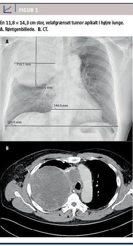 Objektivt fandt man, at han havde svækkede respirationslyde på højre side. Paraklinisk fandt man let forhøjet C-reaktivt protein, let leukocytose med overvægt af eosinofile granulocytter og normale levertal. Ved en CT blev der påvist en stor, velafgrænset, cystisk tumor med en inhomogen opladning apikalt i højre lunge (Figur 1). Desuden var der cystiske lymfeknuder i mediastinum samt cystiske processer i venstre binyre og nyrehilus. Med baggrund i skanningsfundene og hans rejseanamnese blev mistanken om infektion med Echinococcus rejst. Patienten blev testet for Echinococcus-antistoffer og var positiv for E. multicularis, men ikke for E. granulosus. Man påbegyndte behandling med albendazol og planlagde torakotomi med resektion af cysten.