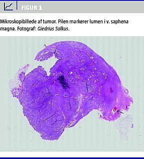En 63-årig tidligere rask kvinde blev af egen læge henvist til en plastikkirurgisk afdeling med henblik på excision af en øm, subkutan knude, der var på størrelse med en valnød og sad anteromedialt på højre lår. Patienten havde bemærket knuden to måneder tidligere og var primært generet af smerter. Der forelå en ultralydskanning af tumor, som var en 14 × 13 × 15 mm stor, velafgrænset, ekkofattig, solid proces med rigelig blodgennemstrømning. Tumoren lå i tæt relation til v. saphena magna, men om den udgik fra venevæggen kunne ikke afgøres.