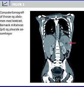 En 16-årig ung mand blev indlagt via en vagtlæge efter seks dages anamnese med halssmerter, abdominalia og svingende febrilia. Før indlæggelsen var patienten blevet fulgt af egen læge, som havde set tilstanden an uden at give antibiotika grundet negativ Strep A-test. Ved indlæggelsen blev der diagnosticeret en peritonsillær absces, som blev dræneret. Grundet svær sepsis og tiltagende respiratorisk påvirkning blev patienten efterfølgende overflyttet til intensiv terapi-afsnit. En computertomografi (CT) af collum, thorax og abdomen viste restabscesser i tonsillejet, pleuraempyem, flere lungeabscesser og en enkelt miltabsces (Figur 1 ). Der blev foretaget pleuracentese og tonsillektomi og påbegyndt bredspektret antibiotisk behandling med piperacillin/tazobactam, metronidazol, ciprofloxacin og gentamicin. Ved bloddyrkning blev der fundet vækst af FN, hvilket er foreneligt med Lemierres syndrom.