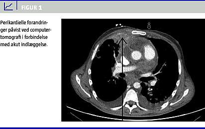 Før svarene på den invasive udredning forelå, fandt man patienten konfus og rodende i hjemmet, hvilket medførte akut indlæggelse. Han blev intuberet og indlagt på en intensivafdeling. Paraklinisk fandt man metabolisk acidose samt svær hyponatriæmi. Patienten var afebril, men havde en forhøjelse af C-reaktivt protein på 281 nmol/l og et leukocyttal på 41,9 mia./l. En ny CT af cerebrum, thorax og abdomen viste progression i de perikardielle forandringer (Figur 1 ). Man planlagde UL-skanning af hepar med biopsi til dyrkning og resistens samt hiv-test. Behandling med penicillin og metronidazol blev initieret. Patienten fik det klinisk bedre og blev ekstuberet efter to dage, herefter blev han overflyttet til en lungemedicinsk afdeling. Der var hurtig fremgang i almentilstanden. På baggrund af den billeddiagnostiske udvikling havde man mistanke om Actinomyces -infektion. Fra leverbiopsien fremkom positiv polymerasekædereaktion (PCR) for Fusobacterium nucleatum. Undersøgelser for Actinomyces og hiv-testen gav negativt resultat. Man fortsatte den langvarige højdosispenicillin- og -metronidazolbehandling, og patienten kom sig fuldstændigt.
