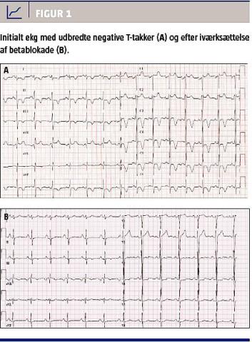 Der blev iværksat betablokade, og patienten blev henvist til en cykeltest og Holtermonitorering, som begge viste normale forhold. Efter en måneds behandling havde patienten det betydeligt bedre med en langsommere hjerterytme under aktivitet og ingen åndenød. En fornyet ekg-optagelse viste, at T-takkerne stort set var normaliserede (Figur 1B).