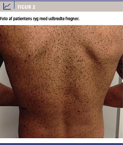 Derudover havde patienten usædvanligt mange fregner over hele kroppen og specielt i ansigtet, hvor de var konfluente (Figur 2). Han oplyste, at fregnerne havde været til stede siden treårsalderen, og at de igennem hele hans tilværelse næsten dagligt var blevet kommenteret af omgivelserne.