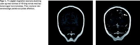 Ved indlæggelsen var patienten i god almentilstand, og de eneste objektive fund var bilateral hørenedsættelse. Samtlige rutineblodprøver var upåfaldende. En computertomografi (CT) af cerebrum med kontrast blev initialt tolket som vi-sende normale forhold, men efterfølgende revidering af bil-lederne gav mistanke om LC. Mistanken blev skærpet ved supplerende magnetisk resonans (MR)-skanning af cerebrum med kontrast (Figur 1 ), der viste meningeal opladning parie-to-occipitalt bilateralt, hvilket er foreneligt med LC. Under-søgelse af cerebrospinalvæsken (CSF) gav følgende resultater: 60 × 106 /l leukocytter med 90% af mononukleær type, CSF-protein 0,8 g/l og CSF-glukose 1,7 mmol/l (serumglukose 5,2 mmol/l). Der kunne ikke påvises maligne celler i CSF.