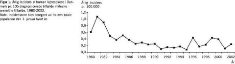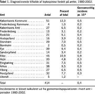 I 1980-2002 blev der diagnosticeret 414 tilfælde af leptospirose i Danmark, hvoraf 86 (21%) blev anmeldt til Epid. Afd. Alle anmeldelser var laboratorieverificerede. Der var en faldende tendens for antal diagnosticerede leptospirosetilfælde i tidsrummet (Figur 1 ). Gennemsnitlig var der 18 tilfælde/år svarende til en incidens på 0,4/105 , flest i 1981 med 55 tilfælde, svarende til en incidens på 1/105 , og færrest i 1995 med fire tilfælde, svarende til 0,1/105 . Inden for de seneste ti år var de højeste forekomster i 1996 og 1999 med 0,4/105 . Den højeste gennemsnitlige årlige incidens af leptospirose var i Ribe Amt med 0,9/105 , efterfulgt af Ringkøbing, Viborg og Storstrøms Amter samt Københavns Kommune med hver 0,5 tilfælde/105 (Tabel 1 ).