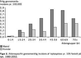 I en tidligere opgørelse i Danmark blev der beregnet en årlig incidens på 0,09/105 indbyggere [14]. Denne meget lavere forekomst kan delvis forklares ved eksklusion af serovar patoc alene som diagnostisk positiv for leptospirose. Det er anbefalet at medtage serovar patoc ved screening for leptospirose hos mennesker [7]. I vores materiale var reaktion med Patoc også den hyppigst forekommende med 40% af samtlige tilfælde. Tallene for forekomsten af leptospirose i Danmark må dog anses for at være behæftet med usikkerhed bl.a. på grund af underrapportering. Da sygdommen er sjælden og med ukarakteristiske symptomer, er der endvidere risiko for underdiagnosticering, hvilket også er antaget i flere andre undersøgelser [1, 13-16]. Samtidig kan man forestille sig, at læger i områder med mange dambrug oftere har mistanke om denne diagnose, hvilket bl.a. kan være baggrund for den signifikante forekomst af serovar icterohaemorrhagiae blandt mænd. Materialets utilstrækkelige datakvalitet udelukker desværre, at der kan foretages en nærmere beskrivelse af årsagerne til køns- og aldersforskelle ved smitte, herunder den øgede forekomst af serovarerne sejroe og patoc blandt kvinder.