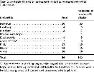 I Tabel 2 ses de anmeldte tilfælde fordelt på formodet smittekilde. Oplysning om mulig smittekilde var oplyst for 73 (85%) af de 86 anmeldte tilfælde. For 41 tilfælde (48%) var smittekilden relateret til beskæftigelse, heraf dambrug med 26 tilfælde. Blandt samtlige diagnosticerede tilfælde fordelte de tre hyppigste serovarer sig med patoc = 166 (40%), icterohaemorrhagiae = 107 (26%) og sejroe = 90 (22%). Herefter fulgte bratislava og poi med henholdsvis 21 (5%) og 11 (3%) tilfælde. Øvrige diagnosticerede serovarer udgjorde i alt 4%: saxkoebing ni, hardjo to, ballum to, hurstbridge tre, pomona et, grippotyphosa et og bataviae et. Serovar icterohaemorrhagiae forekom hyppigere hos mænd (OR 2,9; konfidensinterval [CI] 1,73-4,87) end hos kvinder, mens det modsatte gjorde sig gældende for serovarerne sejroe (OR 2,37; CI 1,48-3,80) og patoc (OR 1,72; CI 1,14-2,62).