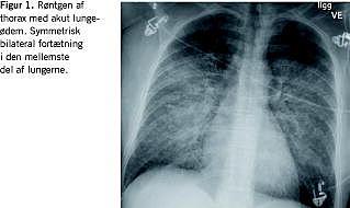 En 49-årig rask kvinde blev kl. 12.30 indbragt til skadestuen efter fald fra en hest. Angiveligt havde hesten stejlet, hvorefter hun faldt af, og hesten væltede ned over hendes abdomen og bækken. Ved ankomsten klagede patienten over smerter i højre hofte og smerter i nedre venstre kvadrant af abdomen. Røntgen af bækkenet viste normale forhold. Herefter blev computertomografi (CT) af abdomen gennemført. Kl. 13.38 blev der indgivet kontrast (iomeprol, 150 ml, 4 ml/s), og i tilslutning til undersøgelsen klagede patienten over en klemmende fornemmelse i halsen. Umiddelbart måltes blodtrykket til 135/70 mmHg, og symptomerne fortog sig. CT'en viste ingen tegn på traumatiske læsioner og helt normale forhold i de medskannede basale lungeafsnit. Patienten blev returneret til skadestuen til fortsat observation, hvor hun ca. 35 minutter efter kontrastindgift blev akut påvirket med blodtryksfald til 88/60 mmHg, bleghed og dyspnø. Iltbehandling på maske indledtes, men trods dette var saturationen faldende, hvorfor patienten blev intuberet. Umiddelbart inden intubationen havde en røntgenundersøgelse af thorax vist begyndende lungeødem. På mistanke om allergisk reaktion blev der givet adrenalininhalation 0,5 mg/ml, 4 ml, clemastin 2 mg og hydrocortison 200 mg intravenøst (i.v.). Foranstående blev yderligere suppleret med methylprednisolon 80 mg, furosemid 80 mg i.v. En akut ekkokardiografi kl.15.45 viste uddrivningsfraktion på ca. 50%, ingen tegn på hjertekontusion og intet perikardieekssudat.