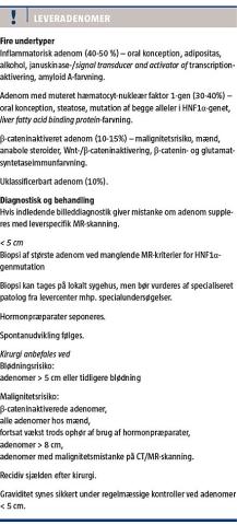 Diagnostik, typeinddeling og behandling af leveradenomer er en kompleks klinisk problemstilling og bør håndteres af specialafdelinger. Hæmodynamisk ustabile patienter må akut laparotomeres med »pakning« af leveren inden overflytning. Billeddiagnostik, specielt MR-skanning og nye molekylære analysemetoder, muliggør en ny klassifikation af leveradenomer, hvilket differentierer β-cateninaktiveret adenom fra de andre undertyper og muliggør resektion før eventuel malign tranformation til HCC.