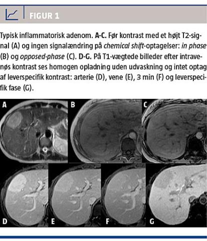 Ved MR-skanning før kontrast er adenomer iso- eller hyperintense på T2-vægtede billeder, og på T1-vægtede billeder kan de have alle signalintensiteter afhængigt af indhold af fedt, blødning og nekrose [19]. De udviser forskellige opladningsmønstre, og en analyse af signalintensitet og opladningsmønster muliggør differentiering mellem forskellige undertyper: inflammatoriske adenomer (Figur 1) har et højt T2-signal med endnu højere signal i tumorperiferien, forårsaget af dilaterede sinusoider. På T1-vægtede billeder er de iso- eller lethyperintense, de er uændrede ved chemical shift-optagelser, da de ikke indeholder fedt og har kraftig arteriel opladning, som persisterer i venefase og sen fase.