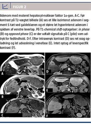 β-cateninaktiverede og uklassificerbare adenomer har ikke et specifikt udseende på en MR-skanning, men de indeholder ikke fedt, har oftest kraftig arteriel opladning med eller uden udvaskning og kan ligne HCC [22]. Vha. MR-skanning kan man således skelne de fedtholdige adenomer med muteret HNF1α-gen fra de øvrige typer. Fælles for alle adenomtyper er, at de i modsætning til FNH ikke indeholder galdeveje og derfor ikke optager hepatobiliær, leverspecifik MR-kontrast. Det gælder både for gadobenatdimeglumin, som er et gadoliniumkelat, hvor 5% af kontrasten optages i levercellerne og udskilles i galdevejene 1-3 timer efter indgift [23], og for gadoxetat, hvor op til 50% af kontrasten optages i levercellerne og udskilles i galdevejene efter 15 minutter [24].