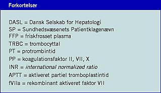 Den prognostiske værdi af vurdering af det eksterne koagulationssystem udtrykt som protrombintid (PT), koagulationsfaktor II, VII, X (PP) eller som international normalized ratio (INR) synes mere kontroversiel [3-5]. I nogle meget store studier, der tilsammen omfatter over 100.000 biopsier på patienter med INR ≤ 1,5, var risikoen for fatal blødning så lille som 1:10.000-1:12.000 [8]. I et engelsk prospektivt studie [9] med 185 centre og 1.500 biopsier var fatale blødninger noget hyppigere (1,3-3,3 pr. 1.000). I sidstnævnte studie var transfusionskrævende blødning hyppigere ved INR 1,3-1,5 (7,1%) end ved INR < 1,3 (3,3%). Men i flere andre studier har det været svært at vise en tilsvarende sammenhæng [3, 5, 10]. De fleste antager, at der er en vis værdi ved monitorering af den eksterne koagulation, og at der derfor bør være en grænse i relation til leverbiopsi. En grænse for INR på 1,4 eller 1,5 er mest anvendt, selv om evidensen er yderst sparsom [3, 5, 8].