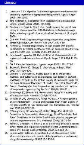 Den mest gennemarbejdede kliniske retningslinje vedrørende leverbiopsi er produceret af British Society of Gastroenterology [3], og den er senest revideret i 2004. Heri anføres, at blødningsrisikoen ved leverbiopsi kan anses for acceptabel, hvis PT < 4 s forlænget (≈ INR 1,4) og TRBC > 60 × 109 /l. Ved PT-forlængelse på 4-6 s (INR 1,4-1,6) anses biopsi for tilladelig, hvis PT-forlængelsen reduceres til < 4 s (INR < 1,4) efter 12-15 ml FFP/kg. Ved TRBC 40-60 × 109/l skønnes biopsi tilladelig, hvis tallet hæves til > 60 × 109 /l med trombocytkoncentrat. I modsat fald anbefales metoder, som transjugulær biopsi eller laparoskopisk biopsi, der antages at være mere sikre, selv om randomiserede undersøgelser ikke foreligger.
