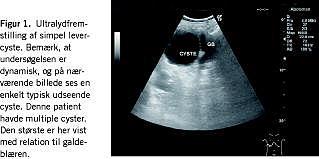 Levercysters forekomst i befolkningen varierer fra ca. 0,1% og helt op til 20% [1, 2]. Den øgede anvendelse af ultralydskanning og computertomografi (CT) har medført hyppigere diagnostik, da nu også de mindre levercyster findes. Prævalensen er fortsat mindre end for nyrescyster, men mellem de to cysteformer er der et sammenfald, som øges med alderen uden signifikante kønsforskelle for de asymptomatiske cysters vedkommende [2], mens de symptomatiske forekommer i forholdet 9:1 hos kvinder og mænd. Simple cyster kommunikerer yderst sjældent med galdevejene, og en arbitrær grænse for intervention har været sat til seks cm (Figur 1 ).