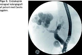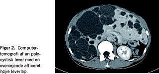 Polycystisk leversygdom er en sjælden benign, autosomal dominant sygdom med en prævalens på omkring 0,001%. Den findes oftest samtidigt med polycystisk nyresygdom. Tidligere anslog man, at ca. halvdelen af patienterne ville få leverkomponenten, men med forbedret overlevelse er andelen oppe på 70-90% [3]. Sygdommen forekommer hyppigere og er af større sværhedsgrad hos kvinder end hos mænd. Den fører stort set aldrig til leversvigt, og symptomerne er overvejende relateret til de polycystiske organers størrelse og fylde med tyngdefornemmelse, mavesmerter, kvalme, opkastninger, tidlig mæthedsfornemmelse, åndenød og evt. obstruktionsicterus. Leverens vægt udgjorde mediant 9% af legemsvægten i en dansk opgørelse af levertransplanterede [4] mod normalt 2%. Sygdommen kan inddeles efter udbredelsen og størrelsen af cysterne (fra grad I; få store cyster (< 10) til grad IV; multiple små til mellemstore cyster diffust i leveren) (Figur 2 ).