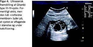 En hydatidcyste opstår efter infektion med Echinoccoccus granulosus, hvor mennesket fungerer som mellemvært. Cysterne lokaliseres i 50-70% af tilfældene i leveren (alle organer kan involveres, næsthyppigst er lungerne 20-30%) og for 85% vedkommende findes de i højre leverlap. Sygdommen forekommer endemisk i Afrika, Asien, Australien, Middelhavsområdet samt Syd- og Mellemamerika. Den har generelt et godartet forløb, men i ca. 3% af tilfældene rumperer cysterne spontant til peritoneum og kan medføre anafylaktisk shock og cysteinfestation i peritoneum. Cysterne klassificeres efter deres ultralydmæssige udseende i fem typer (Ghambis klassifikation), hvor type I ligner simple cyster, og type V er en helt eller delvist kalcificeret cyste. De tidlige stadier I-III kan være behandlingskrævende [6] (Figur 4 ).