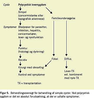 De simple cyster kræver sjældent behandling, men transkutan ultralydvejledt punktur kan anvendes til at afklare symptomatologi med. Man skal være opmærksom på en betydelig infektionsrisiko, som kan mindskes ved profylaktisk antibiotika, og at leversvigt efter punktur af cyster er beskrevet (Figur 5 ). Beslutter man efterfølgende at intervenere ved gendannelse af cysten, anvendes der et skleroserende agens (alkohol eller tetracyklin) til injektion i cysten. Cystevæske og membrandele skal altid undersøges for malign cytologi. Gendannes cysten, og har den været årsag til smerterne eller anden symptomatologi, udføres der laparoskopisk deroofing. Grundet den manglende kommunikation til galdevejene kan væskeudskillelsen fortsætte og resorption fra peritoneum kan finde sted. Såfremt symptomgivende cyster er svært tilgængelige, lokaliseret til en leverlap eller et anatomisk segment, kan resektion komme på tale i svære, behandlingsrefraktære tilfælde. Opfølgning er omdiskuteret, men bør formentligt begrænses til fornyet symptomatologi. I forbindelse med polycystisk leversygdom har det været diskuteret, om forudgående kirurgi vil vanskeliggøre en evt. senere LTX, men fordi der stort set aldrig indtræder leversvigt, udgør LTX en sidste udvej hos patienter med diffus organinvolvering og invaliderende symptomer [4].