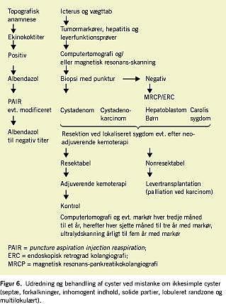 Maligne og præmaligne tilstande adskiller sig billeddiagnostisk fra simple cyster ved at have større tendens til septumdannelse, have en mindre skarpt afgrænset randzone og et uensartet indhold (Figur 6 ). Den præoperative diagnostik skal ledsages af intraoperativ ultralydskanning for at bekræfte den præoperative strategi og udelukke dissemineret sygdom. Der foretages resektion af afficerede segmenter efter gængse leverkirurgiske principper og gives essentielt adjuverende kemoterapi. Om behandlingen skal foregå laparoskopisk eller åbent, er betinget af de neoplastiske cysters udbredelse og placering. Levertransplantation udgør kurativ behandling ved ikkeresektabelt hepatoblastom og diffust udbredt Carolis sygdom, forudsat at der ikke er dissemineret sygdom, og vena portae er åbenstående [9].