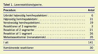 I alt 141 patienter, 71 mænd og 70 kvinder med en medianalder på 58 år (spændvidde: 1-78 år) fik i tiårsperioden foretaget leverresektion. Antallet af resektioner steg signifkant fra to resektioner pr. år i 1995 til 32 resektioner pr. år i 2004. De hyppigste indikationer var levermetastaser fra kolorektale tumorer (n = 72), HCC (n = 18) og neuroendokrine tumorer (n = 12). Af andre indikationer kan nævnes kolangiokarcinom (n = 5), adenomer (n = 5), galdeblærecancer (n = 3), renalcellekarcinom (n = 3), leiomyosarkom (n = 3), fokal nodulær hypoplasi (n = 3) og hæmangiom (n = 3). Typerne af resektioner fremgår af Tabel 1 . Tredive (21%) af patienterne fik foretaget kombinerede resektioner, typisk en højre- eller venstresidig hemihepatektomi suppleret med mindre lokalresektioner. Det mediane transfusionsbehov var tre saltvand, adenin, glukose og mannitol (SAG-M)-portioner svarende til ca. 750 ml (spændvidde: 0-56 SAG-M-portioner). 36% (51 af 141) af patienterne havde ikke behov for transfusioner. Transfusionsbehovet faldt fra mediant fem SAG-M-portioner (ca. 1.250 ml) i perioden 1995-2000 (n = 31) til mediant to SAG-M-portioner (ca. 500 ml) i 2004 (n = 32) (p < 0,05), mens antallet af større resektioner (tre eller flere segmenter) var ens i de to perioder (35% vs. 33%) (p > 0,05). Den mediane indlæggelsestid var ni dage (spændvidde: 3-38 dage).