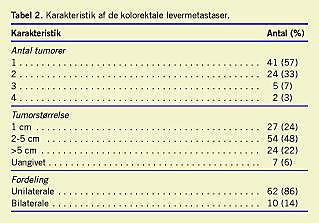Hos de patienter, der fik foretaget resektion af levermetastaser fra kolorektal cancer, var primærtumoren i 68% (49 af 72) af tilfældene lokaliseret i colon og i 32% af tilfældene (23 af 72) i rectum. 79% (57 af 72) af patienterne var klassificeret som Dukes' type C, 13,8% (ti af 72) som Dukes' type B og 2,7% (tre af 72) som Dukes' type A . I to tilfælde var klassifikationen uoplyst. 75% (54 af 72) af patienterne havde synkrone metastaser, og 25% (18 af 72) havde metakrone metastaser. De metakrone metastaser blev diagnosticeret mediant 22 måneder (spændvidde: 12-64 måneder) efter den primære tarmoperation. Levermetastasernes karakteristika er angivet i Tabel 2 . Patienterne havde typisk en eller to metastaser, og de var hyppigst 2-5 cm i diameter. Kun få patienter (14%) havde bilaterale metastaser.